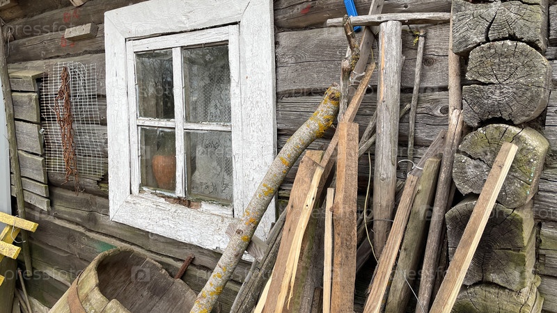 Старая белая деревянная оконная рама в полуразрушенном доме, рядом стоят садовые инструменты и доски