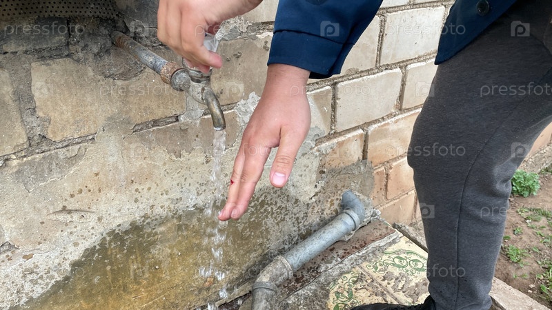 Мужчина моет руки в уличном умывальнике с водой после тяжелой работы, кран белый и кровь на его пальце, травмированная рука