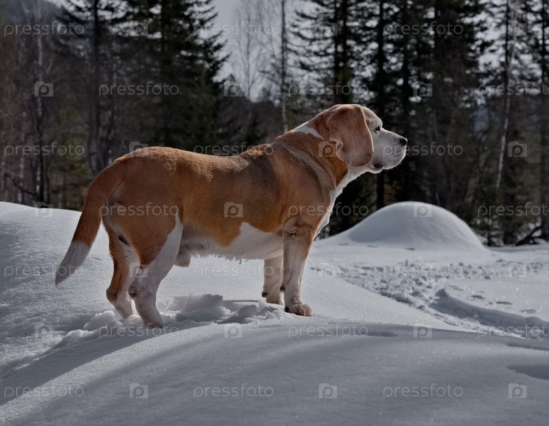 Россия. Кузбасс. Собака породы бигль гуляет по весенней тайге. Это охотничья собака из группы гончих. Издавна ее заводили богатые купцы для охоты на лесную дичь
