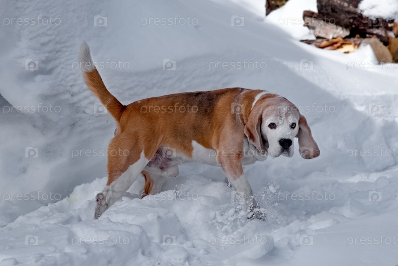 Россия. Кузбасс. Собака породы бигль гуляет по весенней тайге. Это охотничья собака из группы гончих. Издавна ее заводили богатые купцы для охоты на лесную дичь