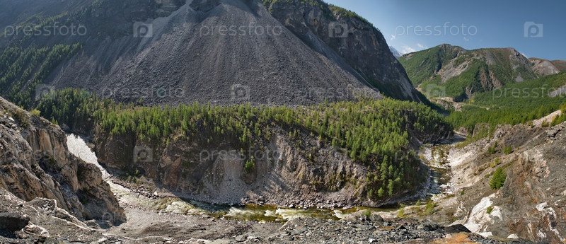 Россия, Республика Бурятия. Панорамный живописный вид на глубокий каньон реки Иркут в Юго-Восточном Саяне недалеко от границы с Монголией