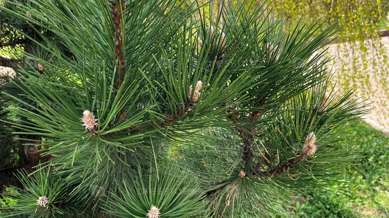 Ветка сосны крупным планом, хвоя ели и молодые приросты