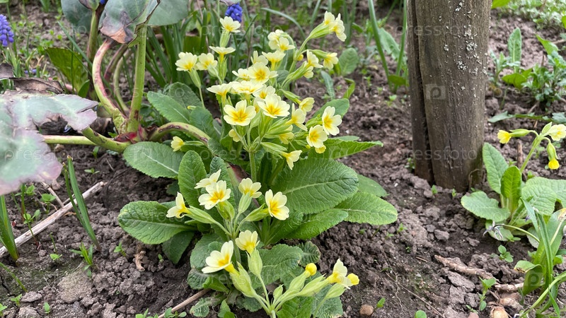 Нарциссы на клумбе цветут весной, белые цветы с желтой серединкой. Первоцвет обыкновенный, или Примула обыкновенная (лат. Primula vulgaris)