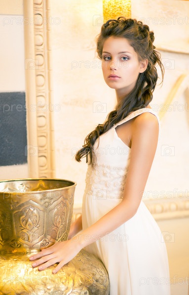 Роскошная брюнетка в белом платье. Золотой восточный интерьер