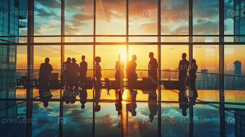 Совместная работа команды в офисе со стеклянными стенами на закате