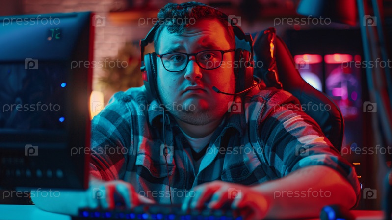 Молодой геймер играет в онлайн-игру с красочной обстановкой