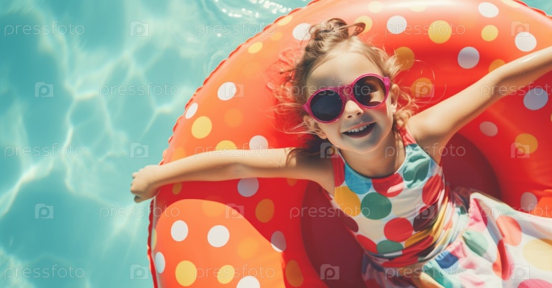 Маленькая девочка в солнцезащитных очках отдыхает на красочном надувном круге в бассейне летним днем
