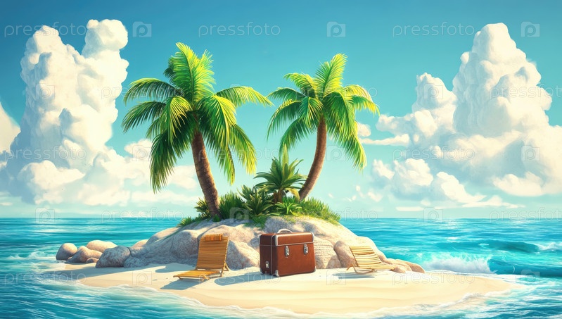 Солнечный райский остров с пальмами и спокойными водами
