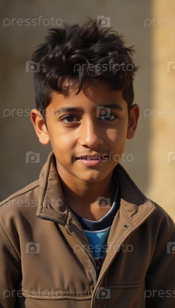 В этот яркий момент йеменский мальчик сияет улыбкой, уверенно стоя на теплом текстурированном фоне, отражая дух молодости и надежды. Генеративный искусственный интеллект