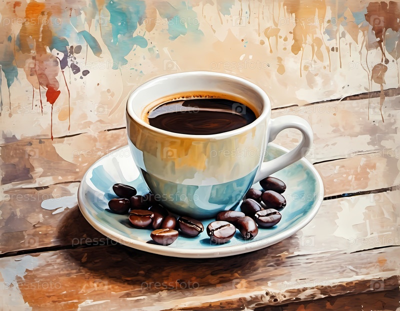 Очаровательная чашка эспрессо, наполненная темным кофе, стоит на тарелке пастельных тонов, а рядом с ней — жареные кофейные зерна. Все это расположено на старинном деревянном фоне, создавая уютную утреннюю атмосферу