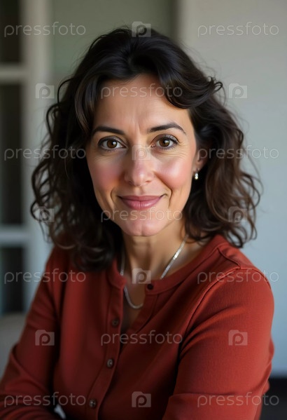 Палестинская женщина элегантно сидит в помещении, ее теплая улыбка и выразительные глаза передают силу и стойкость. Естественный свет подчеркивает ее черты, запечатлевая момент безмятежности