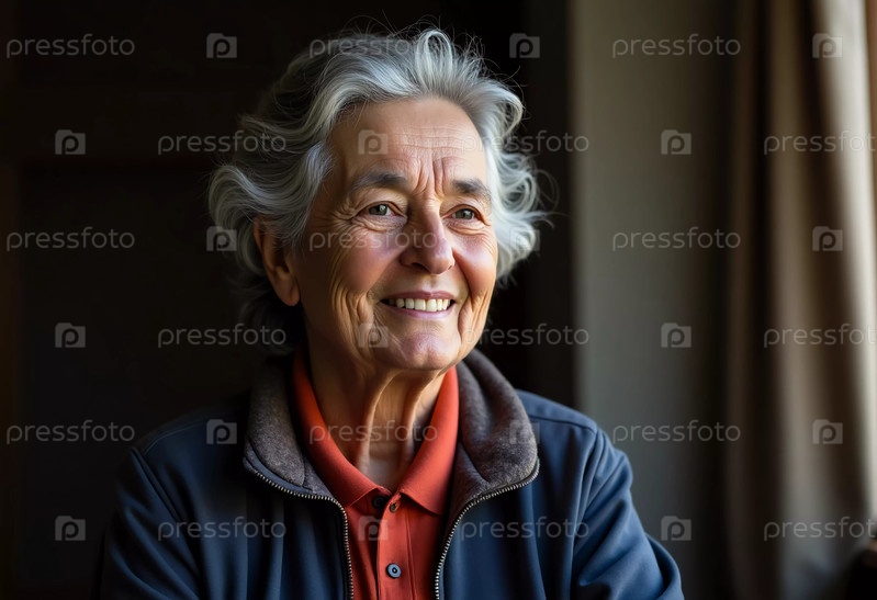 Пожилая женщина из Газы, Палестина, сидит в тепло освещенном помещении, нежно улыбаясь и размышляя о своем жизненном опыте, окруженная воспоминаниями и атмосферой спокойствия