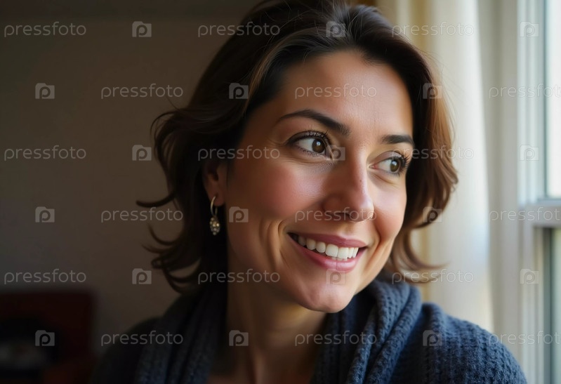 В уютной обстановке палестинская женщина широко улыбается, глядя в окно, олицетворяя стойкость и спокойствие в этот искренний момент благодати