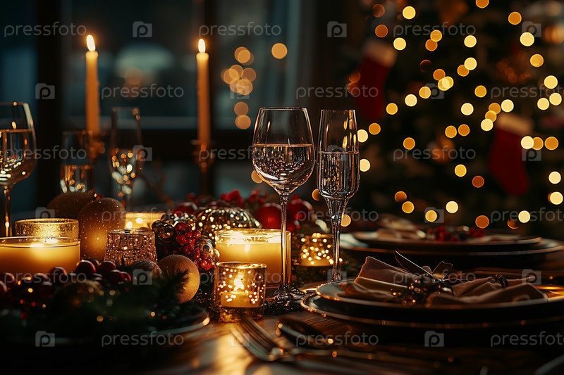 Элегантная праздничная сервировка стола со свечами и шампанским