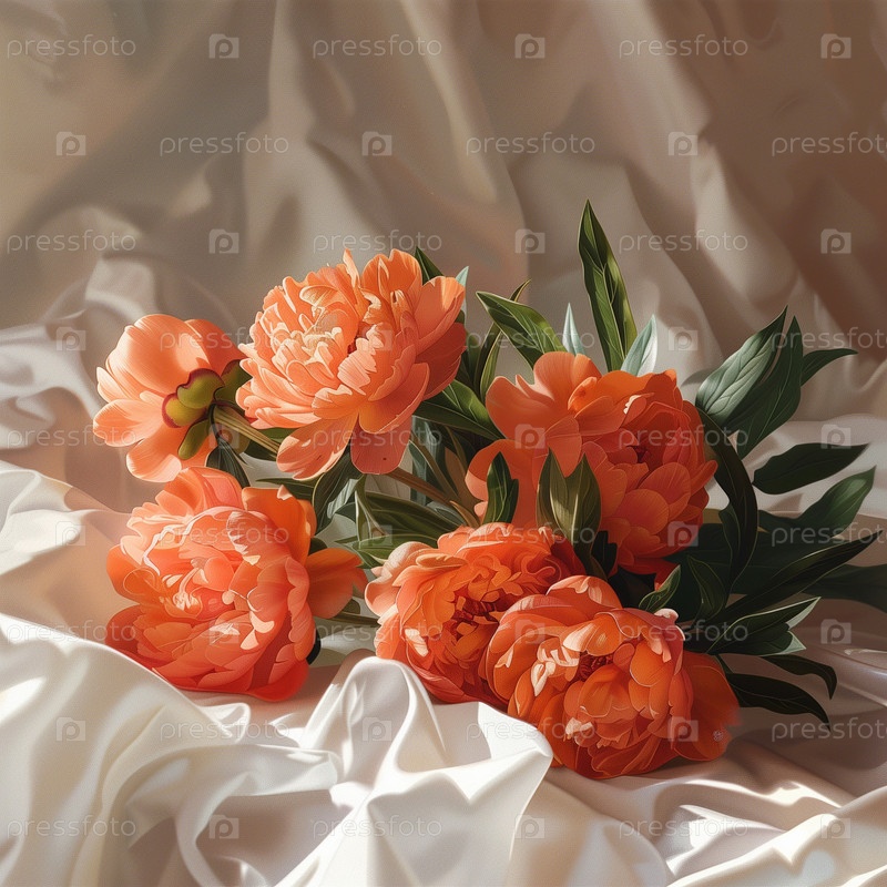 Букет оранжевых пионов, лежащий на кровати утром