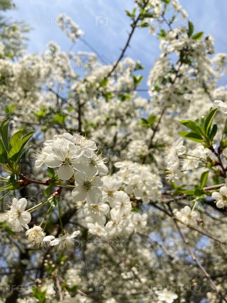 Цветущая ветка с белыми красивыми цветами в саду, весенние обои
