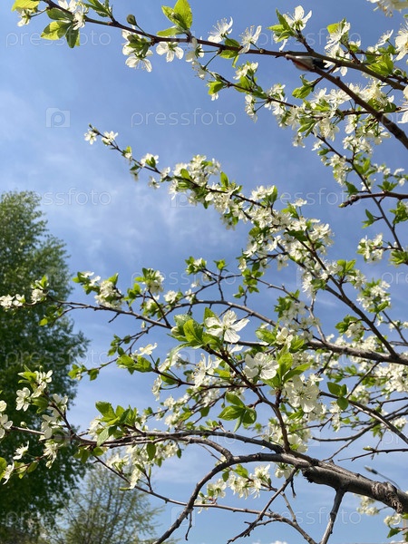 Цветущая ветка с белыми красивыми цветами в саду, весенние обои