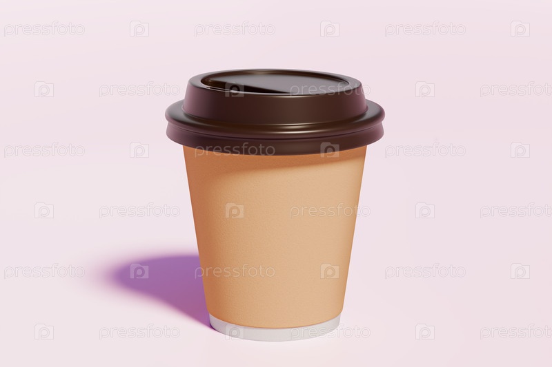 Высококачественная 3D-рендеринг одноразового стаканчика для кофе из крафт-бумаги на вынос с коричневой крышкой на пастельно-розовом фоне. Макет продукта для вашего дизайна. Для дизайна упаковки, маркетинга, брендинга, кофейной культуры