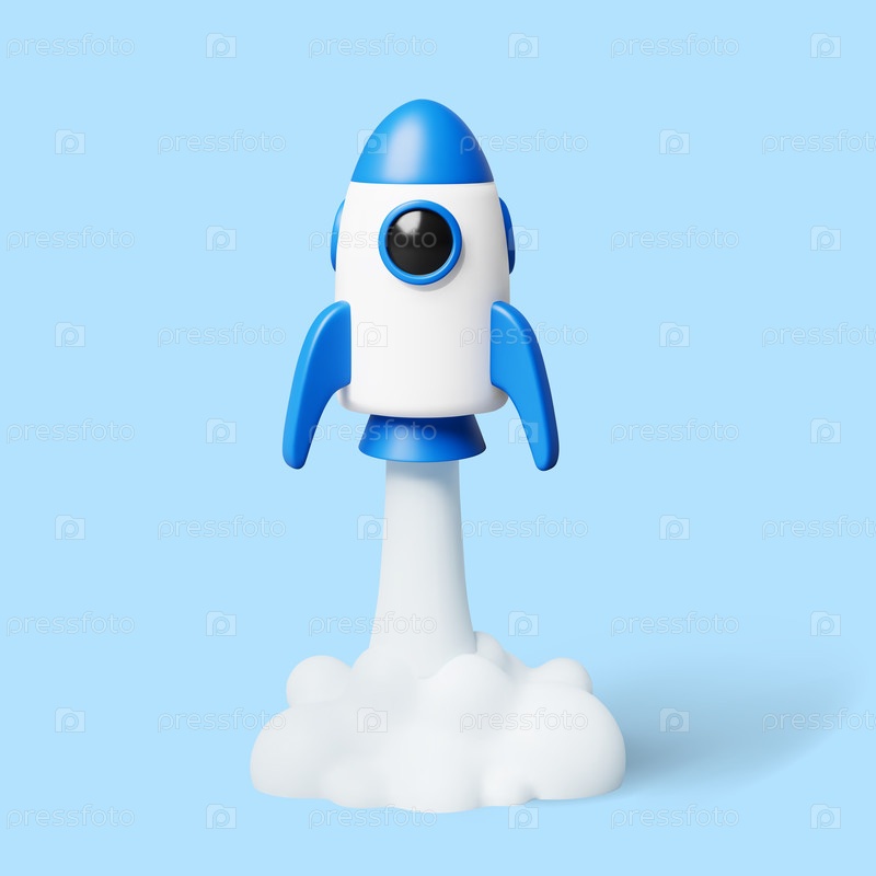 3D мультфильм сине-белая ракета стартует в небо с белым дымом. Элемент дизайна для технологий, стартапов, инноваций, роста бизнеса и концепций освоения космоса. Векторная иллюстрация визуализации