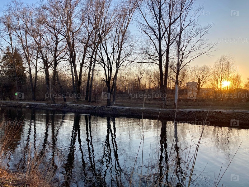 Закат на реке с силуэтом дерева