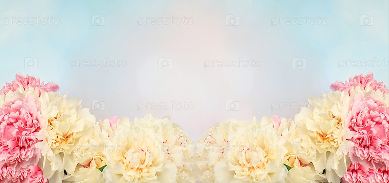 Весенний цветочный баннер с местом для текста. Живые красивые пионы на ярком солнечном фоне, абстрактная цветочная композиция и шаблон для дизайна, поздравительная открытка и флаер для приглашения