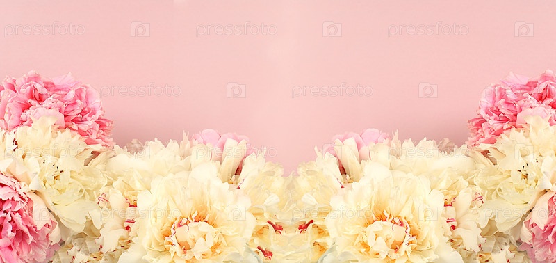 Весенний цветочный баннер с местом для текста. Живые красивые пионы на ярком солнечном фоне, абстрактная цветочная композиция и шаблон для дизайна, поздравительная открытка и флаер для приглашения