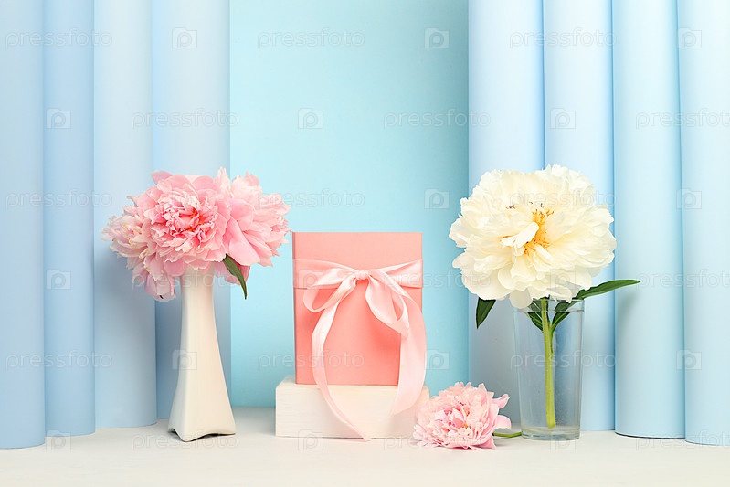 Сцена для демонстрации продукции и бизнес-концепции для продвижения покупок. Пустой премиум-подиум с подарочными коробками. Красивая цветочная композиция с пионами, элегантная концепция красоты, минималистичная современная эстетика,