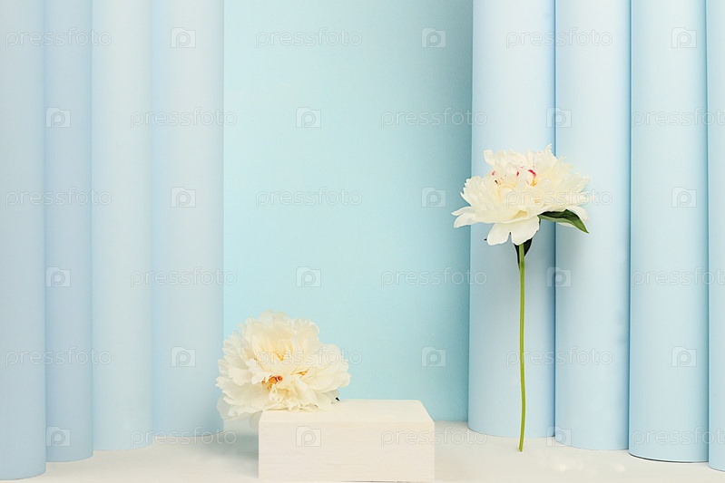 Пустой премиум-подиум и красивая цветочная композиция с пионами, сцена для демонстрации продукции и бизнес-концепция для продвижения покупок. элегантная концепция красоты, минималистичная современная эстетика,