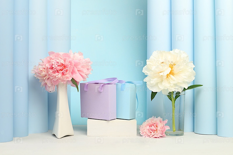 Сцена для демонстрации продукции и бизнес-концепции для продвижения покупок. Пустой премиум-подиум с подарочными коробками. Красивая цветочная композиция с пионами, элегантная концепция красоты,