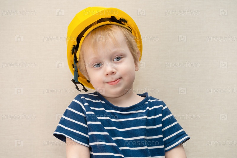 Маленький улыбающийся мальчик в желтой строительной каске. Концепция Дня труда