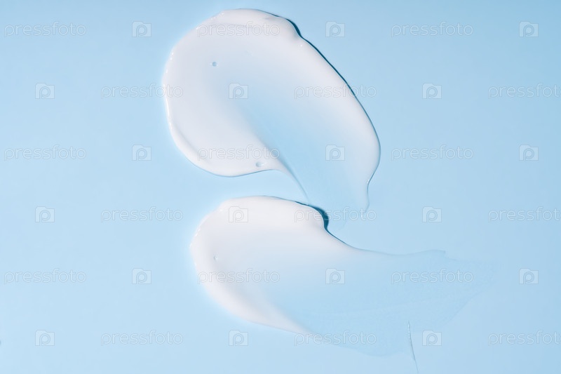Текстура белого крема на синем фоне. Мазок увлажняющего крема крупным планом. Образец лосьона. Мазок средства по уходу за кожей. Образец солнцезащитного крема SPF на синем фоне