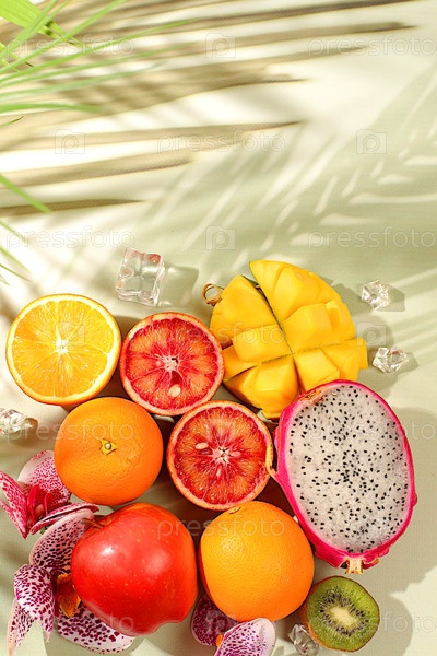 Свежий драконий фрукт, питахайя, манго, кровавый апельсин, лимоны, киви и апельсины крупным планом. Летние экзотические тропические фрукты, баннер для кафе или магазина, открытка для рекламы азиатского рынка