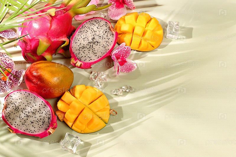 Здоровая веганская еда для похудения, рекламная карточка для магазина. Драконий фрукт, питайя, манго и апельсины на солнечном столе. Летний баннер с тропическими экзотическими фруктами, шаблон для дизайна