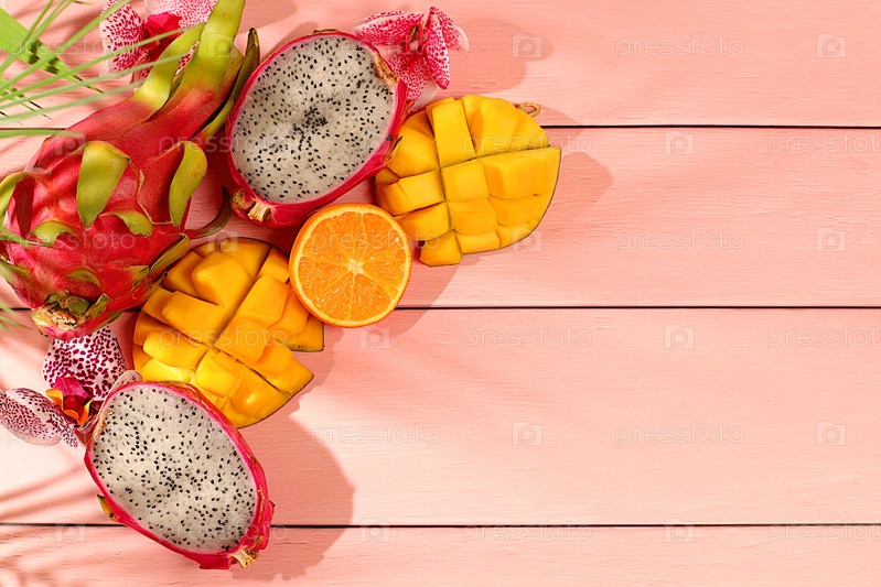 Здоровая веганская еда для похудения, рекламная карточка для магазина. Драконий фрукт, питайя, манго и апельсины на солнечном столе. Летний баннер с тропическими экзотическими фруктами, шаблон для дизайна
