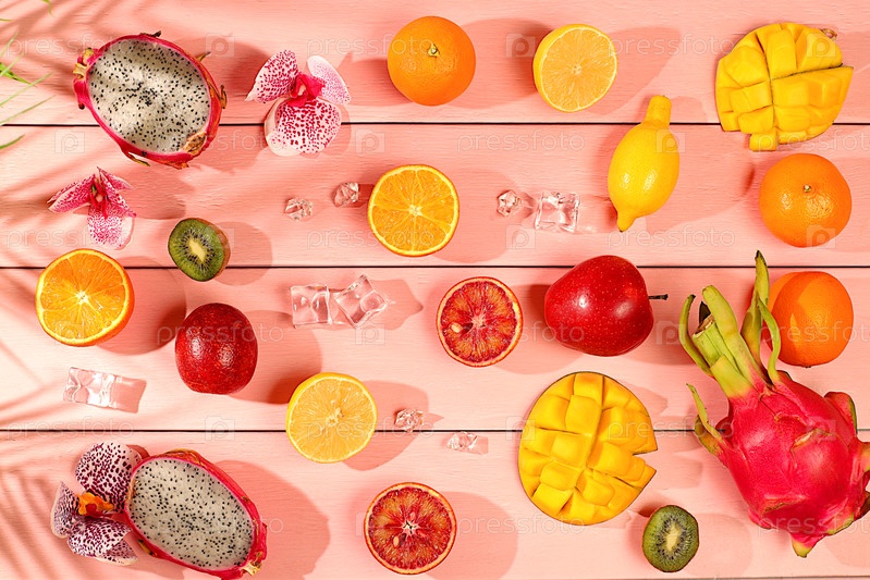 Драконий фрукт, питайя, манго, киви, авокадо, яблоки, цитрусовые и апельсины на солнечном столе. Летний баннер с тропическими экзотическими фруктами. Здоровая веганская еда для похудения, рекламная открытка