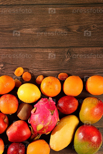Баннер с тропическими экзотическими фруктами и соком на бетонном фоне, летние каникулы и концепция здорового образа жизни. Рекламная карточка для рынка или магазина с местом для текста. Здоровая веганская еда