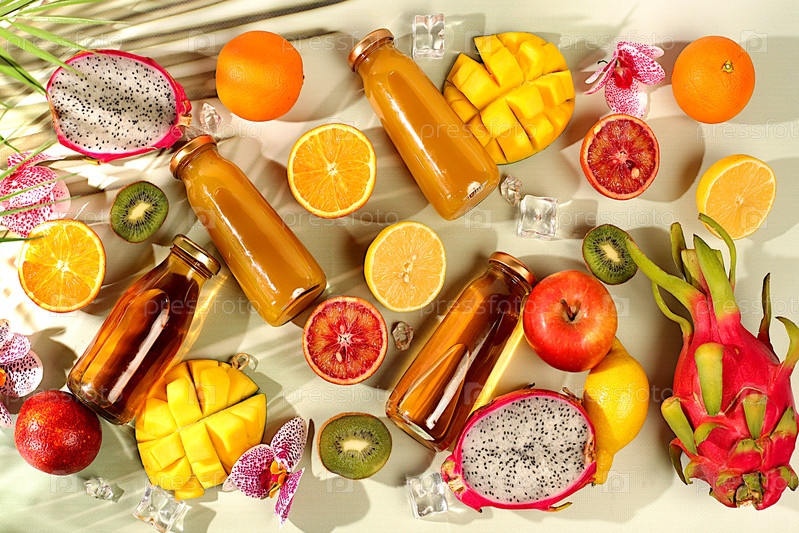 Летние экзотические тропические фрукты. Драконий фрукт, питахайя, манго, кровавый апельсин, лимоны, киви, апельсины и свежевыжатые соки, баннер для кафе или магазина, открытка для рекламы азиатского рынка