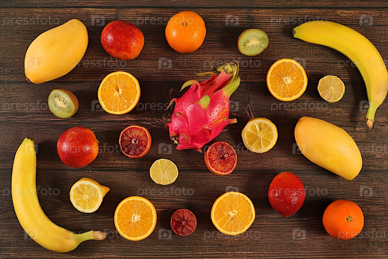 Летние тропические фрукты на деревянном столе, источник витамина С, баннер для магазина, полезные веганские продукты для здорового образа жизни, концепция детокс-диеты и потери веса, реклама магазина