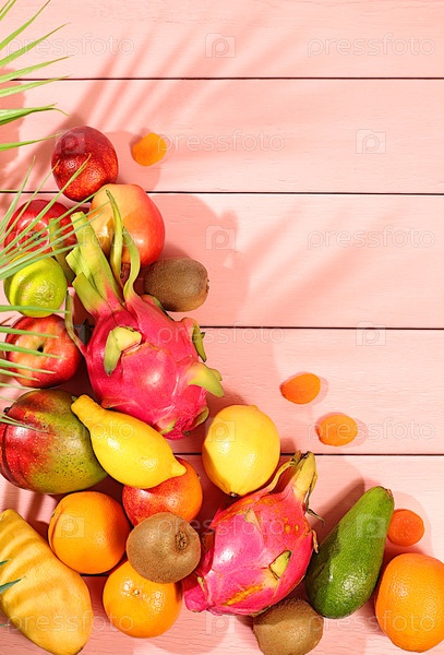Здоровая веганская еда для похудения. Баннер с тропическими экзотическими фруктами и соком. Драконий фрукт, питайя, манго, киви, авокадо, яблоки, цитрусовые и курага на солнечном столе