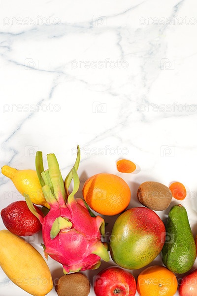 Драконий фрукт, питайя, манго, киви, авокадо, яблоки, цитрусовые и курага на солнечном столе с местом для текста. Здоровая веганская еда для похудения. Баннер с тропическими экзотическими фруктами и соком