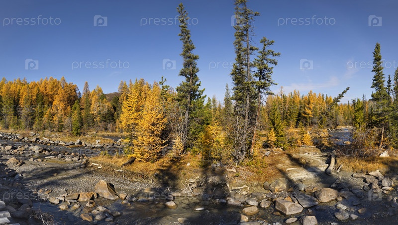 Россия. Юг Западной Сибири, горный Алтай. Осенний вид на долину реки Актру, исток которой находится у подножия ледника на Северо-Чуйском хребте