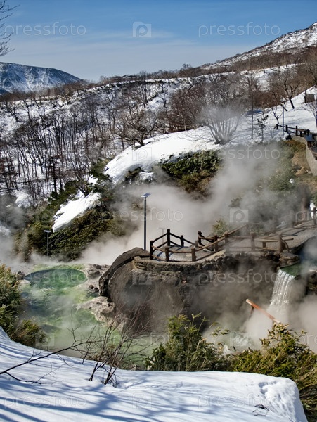 Россия. Курильские острова. Живописный плавучий термальный источник (Кипящая река) недалеко от вулкана Барановский на острове Итуруп, температура воды в источнике которого достигает 80 градусов