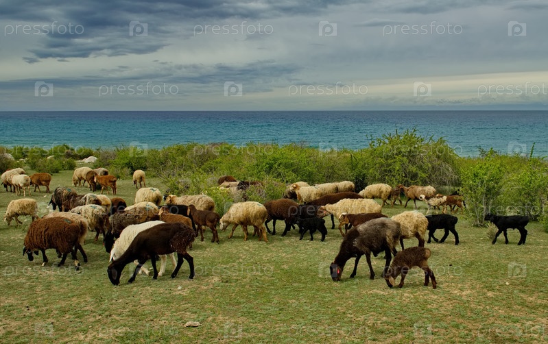 Северный Кыргызстан. Стадо чистокровных овец пасется среди кустарников на берегу озера Иссык-Куль