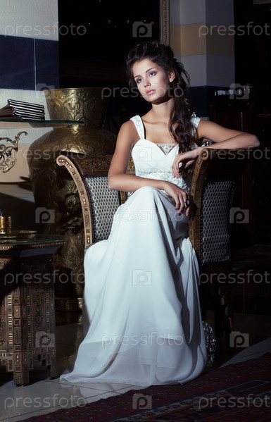 Свадебный стиль. Аристократичная невеста сидит в белом платье. Интерьер ресторана