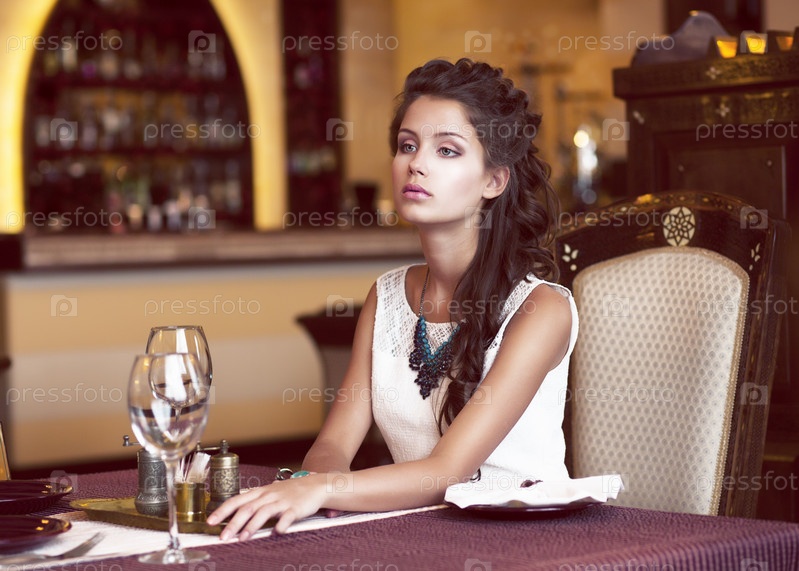 Свидание. Мечтательная женщина ждет за накрытым столом в интерьере ресторана