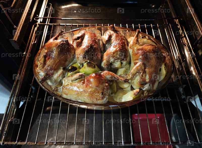 Запеченные в духовке перепела с грушей на блюде. Oven-baked quail with a pear on a platter