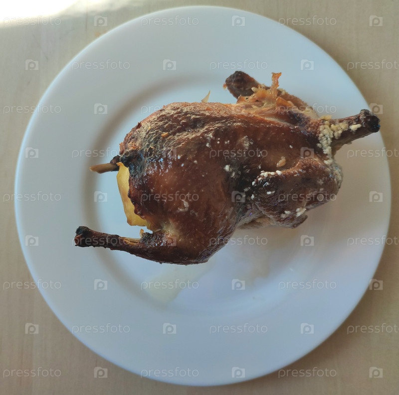 Запеченный перепел на белой тарелке с хрустящей корочкой. Baked quail on a white plate with a crispy crust