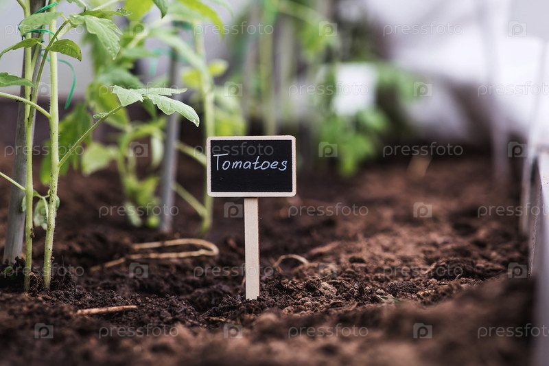 Знак с надписью томаты. Рассада томатов высаживается в грунт. Концепция весенней посадки овощей и сельского хозяйства