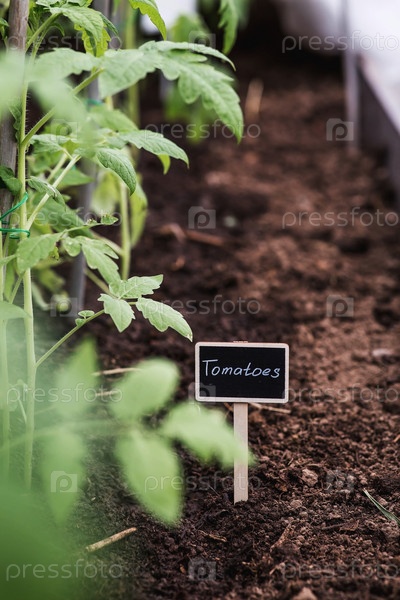 Знак с надписью томаты. Рассада томатов высаживается в грунт. Концепция весенней посадки овощей и сельского хозяйства