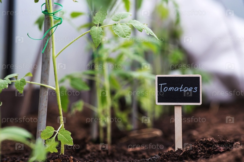 Знак с надписью томаты. Рассада томатов высаживается в грунт. Концепция весенней посадки овощей и сельского хозяйства